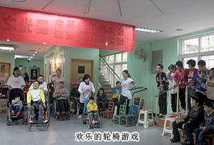 接著,志愿者們還和學(xué)生一起進(jìn)行了輪椅游戲,將志愿者和孩子們分成四組,設(shè)定兩個(gè)跑道,在一句“預(yù)備,起!”的喊聲中,游戲開始,激烈的角逐,讓孩子們紛紛大呼加油,鼓舞的歡聲,引發(fā)了全場的共鳴。