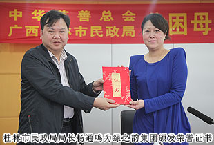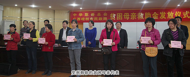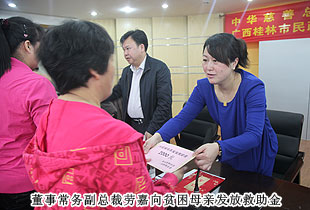 2014年4月11日,“關(guān)愛(ài)貧困母親,讓愛(ài)綻放”——中華慈善總會(huì)貧困母親救助綠之韻愛(ài)心行動(dòng)第三站走進(jìn)廣西桂林,為100名特困母親捐贈(zèng)20萬(wàn)元愛(ài)心善款。中華慈善總會(huì)秘書(shū)長(zhǎng)邊志偉、募捐部主任蘇輝、廣西慈善總會(huì)常務(wù)副會(huì)長(zhǎng)陳利丹、秘書(shū)長(zhǎng)陳克富等領(lǐng)導(dǎo)出席活動(dòng)。綠之韻集團(tuán)董事常務(wù)副總裁勞嘉、全球營(yíng)銷(xiāo)中心華南區(qū)業(yè)務(wù)總監(jiān)兼廣東分公司經(jīng)理梁涌帶領(lǐng)吳季峰、葉海蘭、楊帆等綠之韻愛(ài)心志愿者為愛(ài)行動(dòng)。