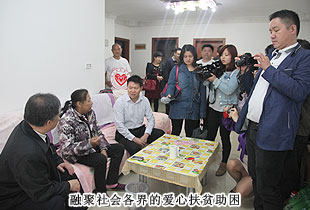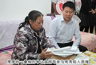 貧困母親馬明秀,患有尿毒癥,丈夫同樣身體抱病,一摞厚厚的病歷單成為這個(gè)家庭最刺眼的標(biāo)簽。桌子上各種各樣的藥罐子,是每月2000多醫(yī)療費(fèi)用的產(chǎn)物,當(dāng)失去了經(jīng)濟(jì)來(lái)源,生的希望就無(wú)情地熄滅了。可是,當(dāng)迎來(lái)慰問(wèn)隊(duì)伍,收到各界的關(guān)懷之后,馬明秀說(shuō):“我曾經(jīng)失去過(guò)活下去的勇氣,但是社會(huì)各界的關(guān)心,讓我又擁有了對(duì)抗病魔的勇氣,我一定會(huì)好好活下去,帶給家人和社會(huì)精神上的正能量。”