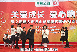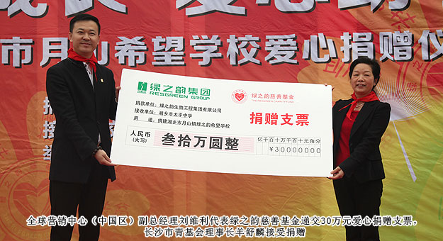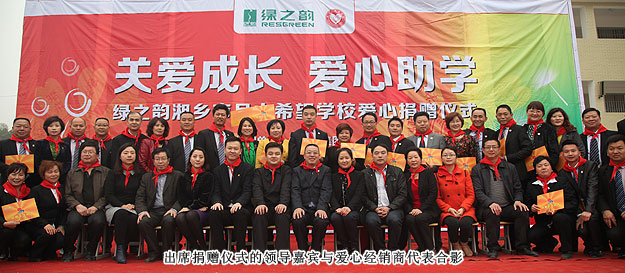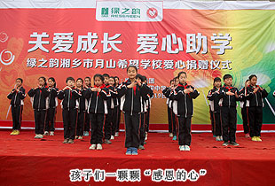 2014年3月19日,由共青團長沙市委、長沙市青基會牽頭,綠之韻集團出資30萬元建設的第九所希望學校——“綠之韻湘鄉(xiāng)市月山鎮(zhèn)希望學校”在湖南湘鄉(xiāng)市揭牌成立。共青團湘潭市委書記白云峰、共青團長沙市委副書記詹萍萍、湘鄉(xiāng)市人大常委會黨組副書記、副主任王建湘、長沙市青基會理事長羊舒麟、月山鎮(zhèn)常務副鎮(zhèn)長徐慧湘等十幾位領導嘉賓出席,綠之韻集團董事長胡國安、全球營銷中心(中國區(qū))副總經(jīng)理劉維利、湖南分公司經(jīng)理張薇與200多位綠之韻愛心經(jīng)銷商共同為愛傳承,為孩子們送上如春天般的融融暖意。