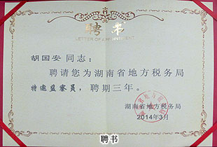 自2008年受聘,2011年連任湖南省地稅局特邀監(jiān)查員以來,胡國安董事長始終認(rèn)真履行職責(zé),了解和反映基層稅務(wù)部門和稅務(wù)人員依法治稅、依法行政的情況,在解決群眾關(guān)心的熱點(diǎn)難點(diǎn)問題,促進(jìn)行風(fēng)政風(fēng)建設(shè)方面取得了矚目的成績,得到了地稅系統(tǒng)領(lǐng)導(dǎo)的高度肯定和一致好評。此次會議,胡國安董事長再一次被聘為特邀監(jiān)察員,成為唯一一位連續(xù)兩次受聘連任湖南省地稅局特邀監(jiān)察員的企業(yè)家。