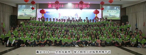 在這個節(jié)日氣氛尚未褪盡的初春時節(jié),為增強(qiáng)員工的團(tuán)隊(duì)凝聚力,提高主動配合意識和協(xié)同能力,促使大家勇于挑戰(zhàn)自我,挖掘潛力,分秒必爭,達(dá)成目標(biāo),進(jìn)一步積極、全面和深入地弘揚(yáng)“厚德載物、目標(biāo)堅(jiān)定、有容乃大、低調(diào)實(shí)干、勇往直前、厚積薄發(fā)、團(tuán)隊(duì)制勝、堅(jiān)持到底、整合資源、改變自我”的綠之韻“水文化”,綠之韻集團(tuán)組織全體員工進(jìn)行了為期三天兩晚的“贏定2014——全員向前沖”訓(xùn)練營活動。