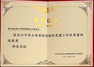 2013年12月25日,毛澤東同志誕辰120周年紀(jì)念日前一天,綠之韻集團(tuán)黨總支部光榮地被中共長沙市非公有制經(jīng)濟(jì)組織工作委員會授予“長沙市非公有制經(jīng)濟(jì)組織黨建工作優(yōu)秀案例優(yōu)勝單位”稱號,其先進(jìn)事跡和黨建工作經(jīng)驗成功入選《長沙市非公有制經(jīng)濟(jì)組織黨建工作優(yōu)秀案例匯編《領(lǐng)航》一書,在全市范圍內(nèi)進(jìn)行宣傳推廣。