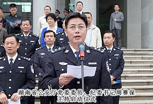 為充分展示五年來湖南省公安機(jī)關(guān)執(zhí)法規(guī)范化建設(shè)取得的成果,全面深化黨的群眾路線教育實踐活動,進(jìn)一步深入推進(jìn)規(guī)范執(zhí)法建設(shè)、和諧警民關(guān)系建設(shè),2013年10月28日上午,湖南省公安機(jī)關(guān)“規(guī)范執(zhí)法警營開放周”活動啟動儀式在長沙市公安局特巡警支隊院內(nèi)正式拉開帷幕。本次活動由湖南省公安廳黨委委員、紀(jì)委書記周賽保主持。